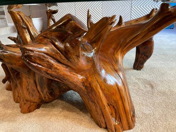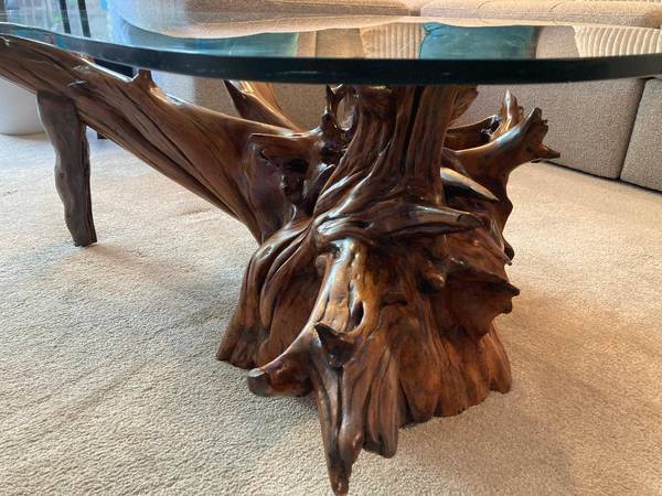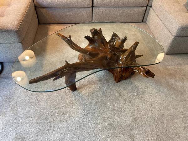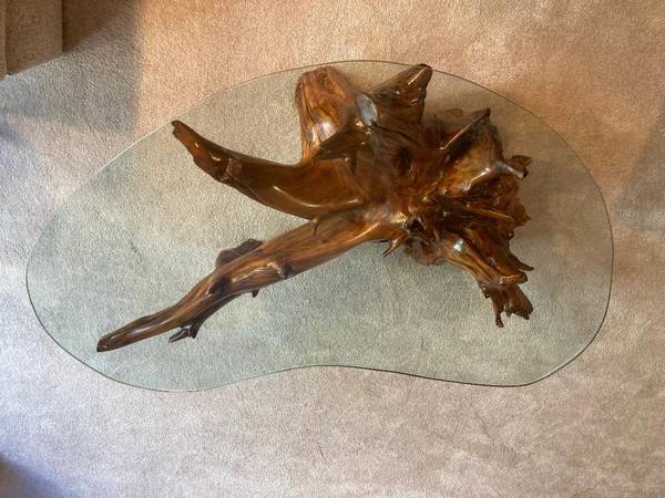 Beautiful custom fabricated glass top coffee table on polished tree root base. Top is 1/2" thick shatterproof glass cut in a graceful kidney bean shape. Glass top is 54" long and 32" wide and sets 16" high above floor surface. Base is a polished ash tree root, there are four adjustable pads under the base that can be adjusted so the table sets solidly on any floor surface.