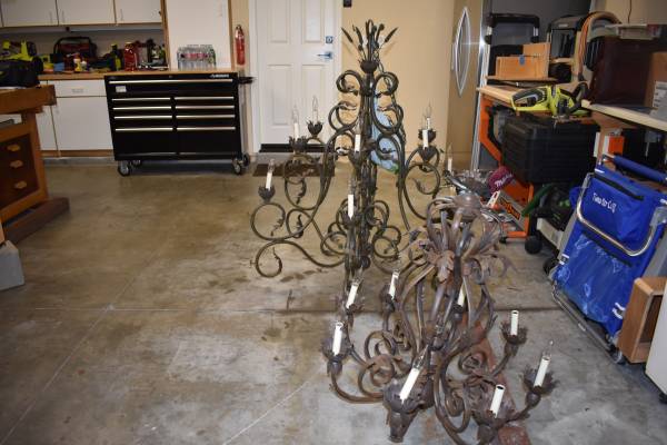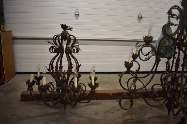 Here are two large Wrought Iron electric chandeliers. They were from our previous home, and we are not using them in our current home. The large one is 52 inches tall and 50 inches wide. The smaller one is 34 inches tall and 31 inches wide. The large one is $100.00, and the smaller one is $50.00. Both are ready to hang and plug in. Look at them and make an offer!