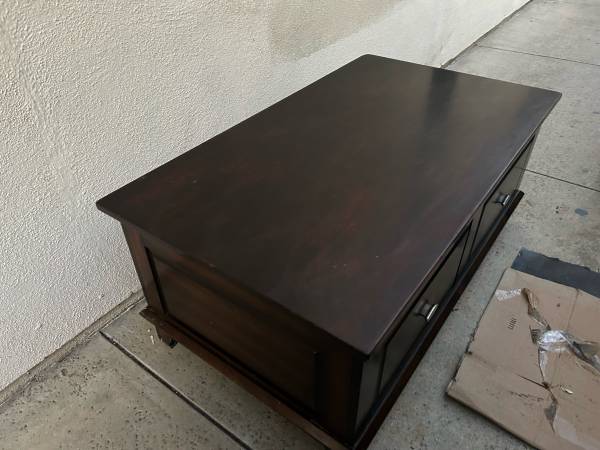 This is a great coffee table what I call a man’s living room dining table nice spring hinge lift top storage and nice drawers all in one use.Measures 48 long by 28 deep and 20 tall closed.If the ad is up we have it in Mission Viejo for the first 250 it was a 599 table so save a bundle.Once you use this table you will know what you have been missing .All nicely wrapped and protected. Excellent condition.We will reply in order to those who leave call back numbers.