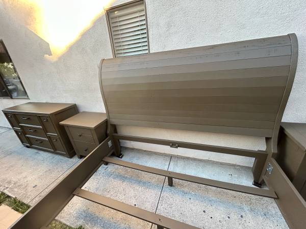Instead of spending 1300 at Costco for a single laminate non wood small 5 drawer dresser get an entire high quality king bedroom wooden set like new with dovetail drawers brass hardware and dual ball bearing drawer guides. This set has large nightstands and high capacity dresser with deep drawers headboard footboard rails slats and I can set it up as well .It’s flawless and all nicely wrapped a beautiful one and done thick made ensemble.Dont lowball yourself out of it save a bundle and be happy .If the ad is up we have it in Mission Viejo .Dresser is 56 long by 19 deep and 35.5 tall nightstands are 27 wide by 17.5 deep and 29.5 tall headboard is 61 tall and 80.5 wide.We will reply in order to those who leave call back numbers