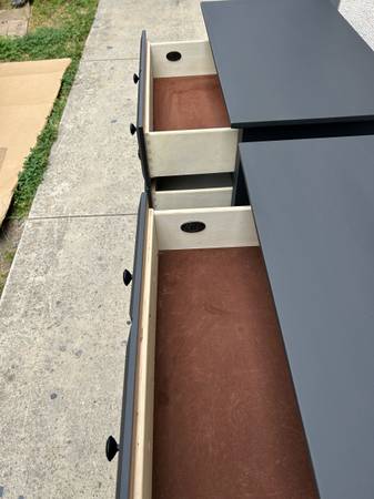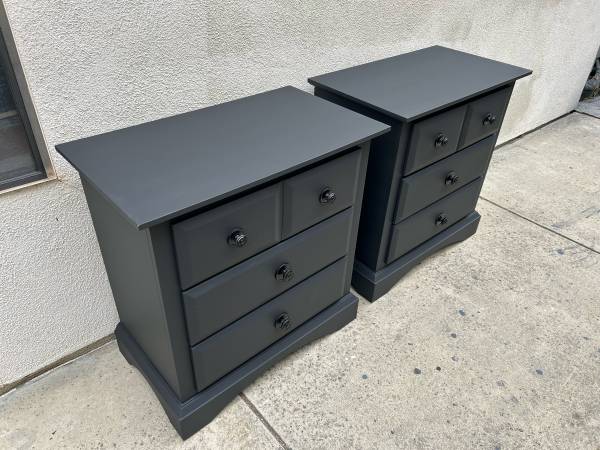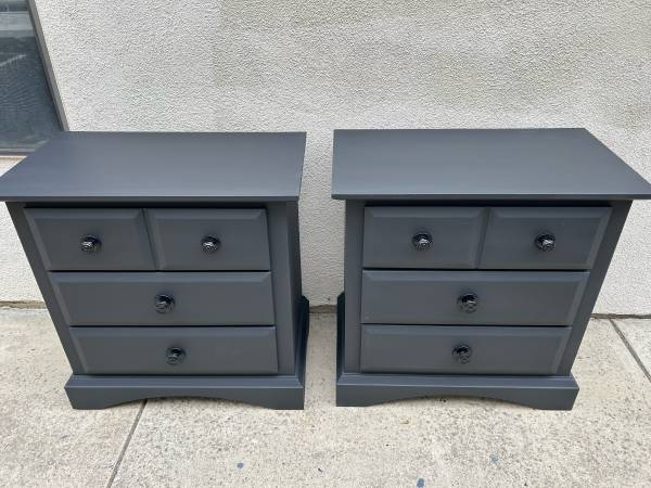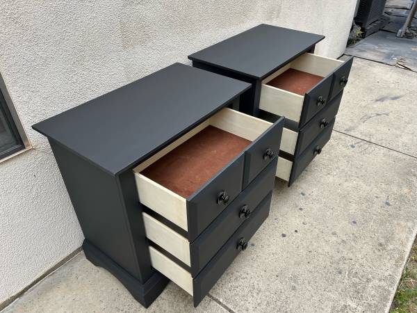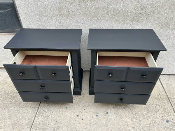 Instead of paying high retail for laminate non wood products get a pair of quality wooden 3 drawer nightstands with dovetail drawers in excellent condition perfect working drawers all nicely wrapped and can deliver local if needed.Measures 27.25 wide by 16.25 deep by 28.75 tall.Save a bundle if the ad is up we have them in Mission Viejo for the first 425.We will reply in order to those who leave call back numbers