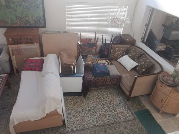 There was an estate sale where some items were unsold, including couches, chairs, framed art, glassware, China dishes, large metal filing cabinets, and a few antiques.