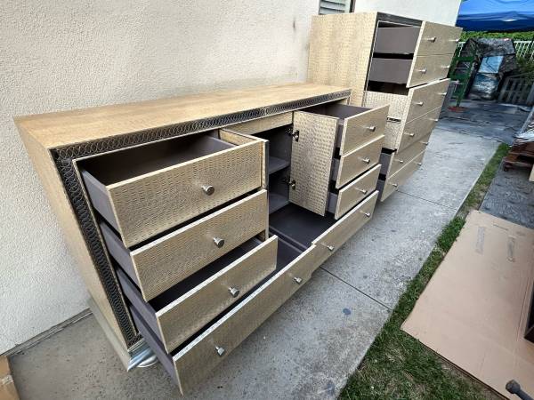 Very high end like new Micheal Amini AICO Dressers less than half cost and can deliver local if needed.Price is firm save a massive bundle here only one buyer gets it .Long dresser with mirror doors is 66 long by 19 deep and 43.5 tall.Tall dresser is 60 tall 46 wide and 19 deep and features a double deep drawer that opens face pull down with plug ins .These have felted soft close doors with ball bearing drawer tracks solid knobs everything feels high end.If you want high end beauty at a fraction of cost this is it.If the ad is up we have them in Mission Viejo .We will reply in order to those who leave call back numbers