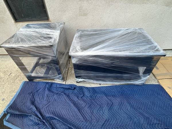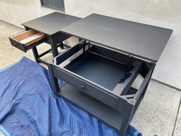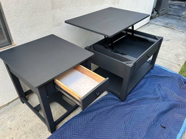 The Coffee table has a spring hinge raising top with storage and locking quality wheels as well.End table has a ball bearing drawer guide .Coffee table is 36.25 wide by 25.25 deep and 20 tall.End table is 22.5 wide by 24 deep and 24 tall .A nice quality complimentary set all nicely wrapped in excellent condition and can deliver local if needed to the first 325 save a bundle .If the ad is up we have them in Mission Viejo .We will reply in order to those who leave call back numbers