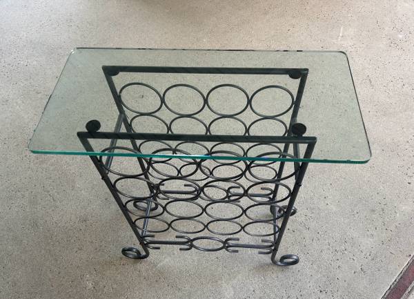 The side table or end table wine rack with glass top is in excellent condition and measures 22 3/4 inches by 11 inches by 27 inches tall. Holds at least 17 bottles and maybe 8 wine glasses (bottom...