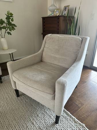 Comfortable beige armchair with dark wooden legs. (Or best offer - Cash only)