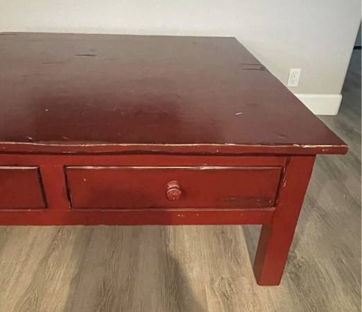Beautiful custom all wood table with 4-drawers is from the local company Butera. This coffee table is in a fabulous Ralph Lauren red with light stain over top. Distressed top adds to visual...