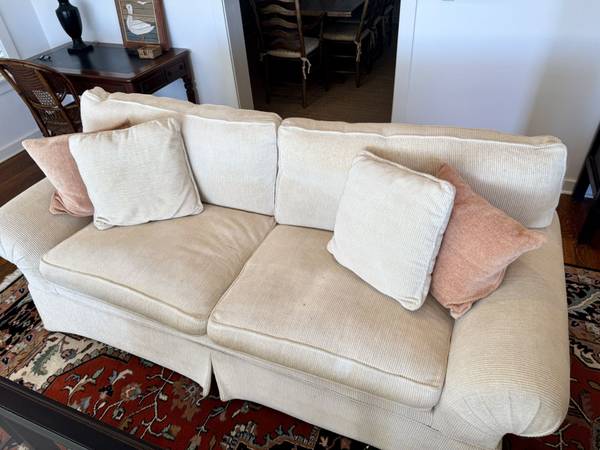 Two large cream colored couches. They are well loved and could use a deep clean, but structurally they are in great shape and high quality couch. Nothing broken, no tears in the fabric. Smoke free home. 89” long and 36” deep.