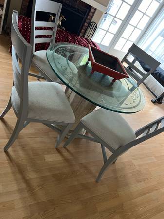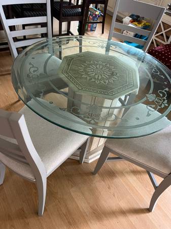 Round dining room table 4 chairs Glass top with design-light blue-grayish fabric 42” w X 29” high see photos before texting. must pickup Cash only No pets smoke-free home. No scammers No phone calls