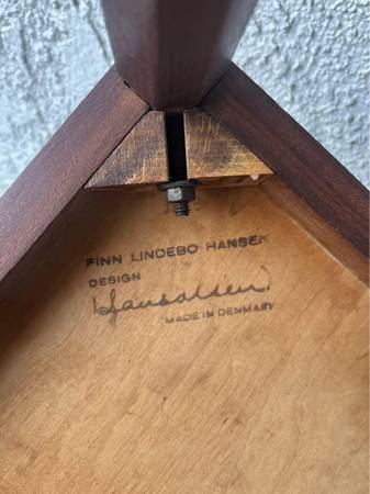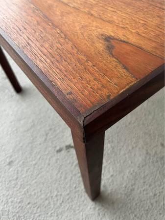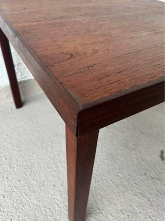 Beautiful vintage Hans Olsen for Finn Lindebo Hansen teak side table. This is damaged, I purchased this from a vintage dealer as a fixer upper because the wood is split on the corners which makes the legs loose and never got around to fixing it. Perfect height, beautiful wood grain.