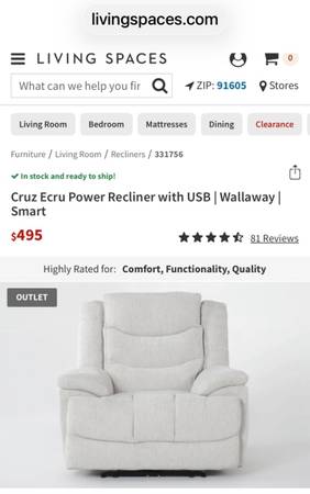Living Spaces recliner with USB port. Like new. Very comfortable. Hardly used. Had less than a year.