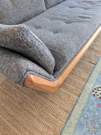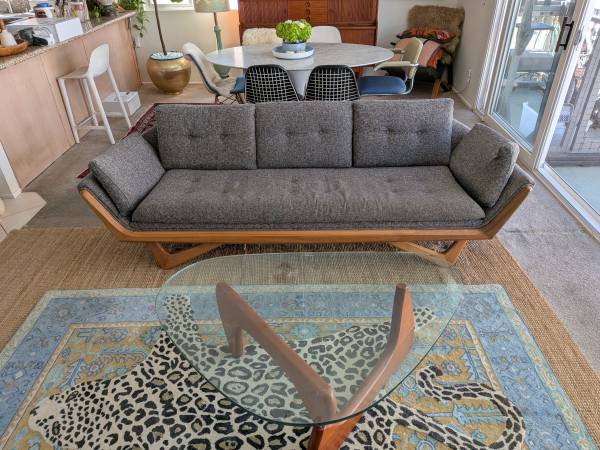 Mid Century Adrian Pearsall Style Couch Sofa in very good condition. It is made in California, solid walnut front and legs. Grayish tweed fabric. No Pulling or stains. Very comfortable and stylish....