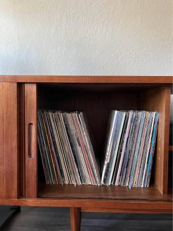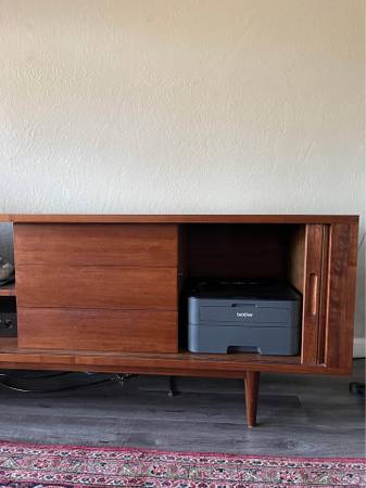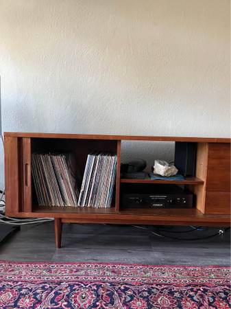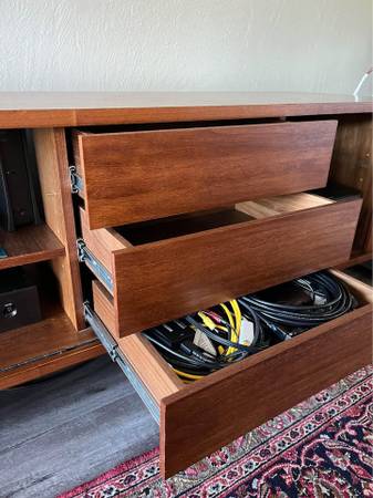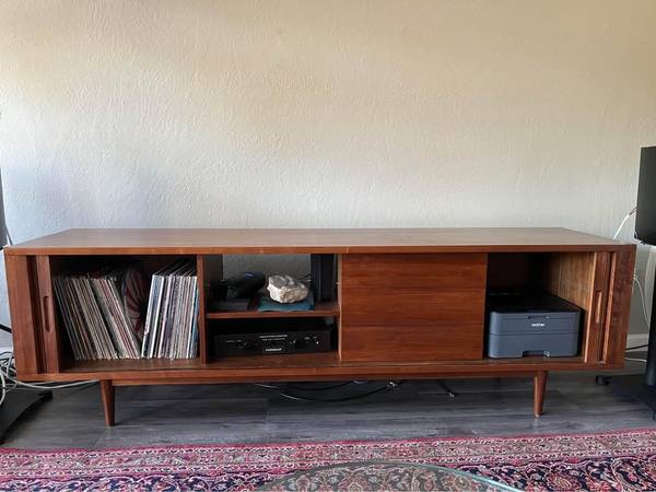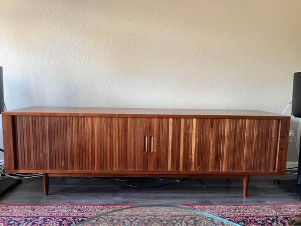 Custom vintage inspired mcm walnut credenza. I had this custom commissioned by a high end master wood worker. Made with beautiful walnut, this credenza is a work of art. Inspired by vintage 60’s and 70’s media consoles with tambour door architecture, this piece features multiple compartments for different storage applications, vinyl, media, books, etc.. shelving for each compartment with adjustable height. The center compartment is intended for home theatre or electronics with open rear back panel for wiring and cabling. 3 push to open drawers for storage. Much higher quality construction and craftsmanship than DWR (Design Within Reach), Room & Board, Restoration Hardware, CB2 Crate and Barrel etc.. Custom slat tambour sliding doors with alternating stain finish and wood grain. Please see measurements below. 2 strong people and a cargo van will be needed to transport this. $5500+ piece. Price is firm.