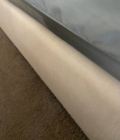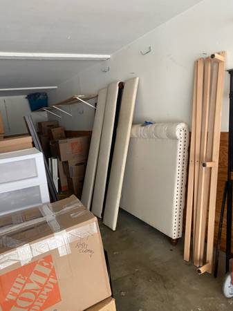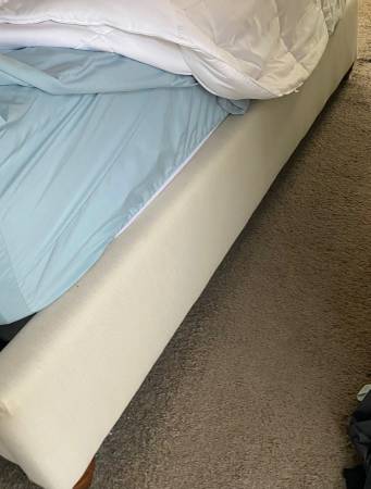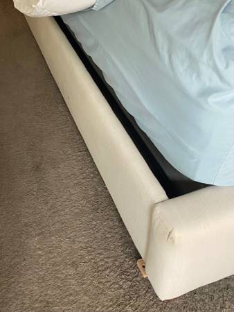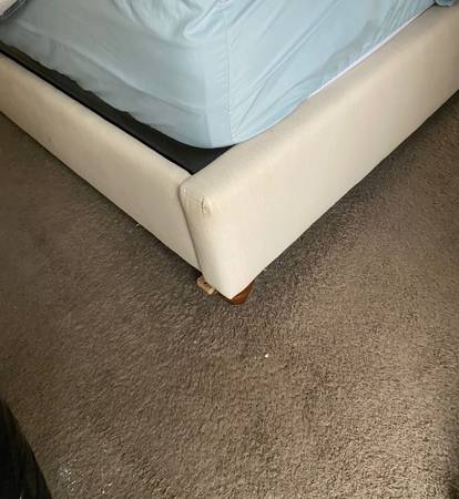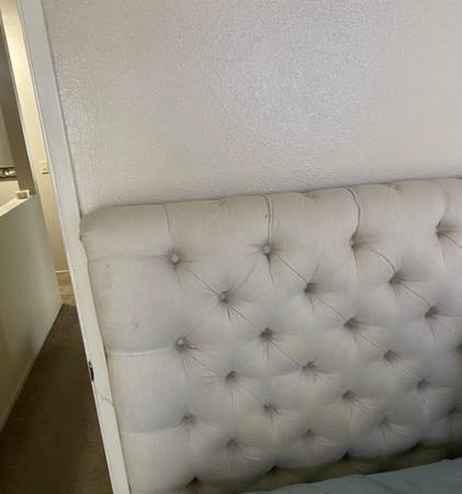 Beautiful Pottery Barn king size bed frame with tufted upholstered headboard, nailhead trim, and solid wood construction. Originally purchased for $4,000. ✔️ Elegant neutral fabric ✔️ High-quality...