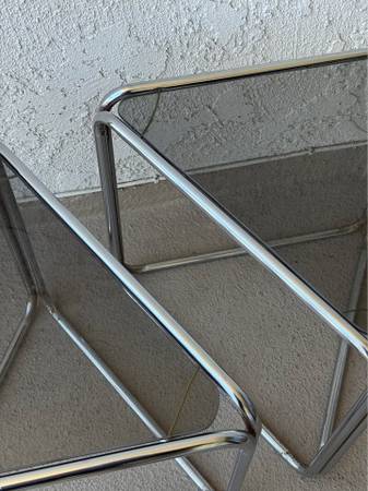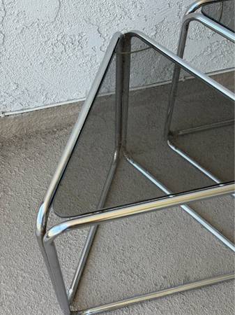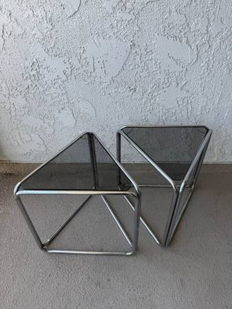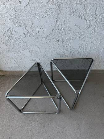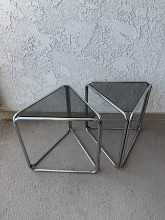 True vintage chrome tinted glass side tables. The chrome could use a polish. Purchased from a highly curated mcm vintage shop years ago, these are from the 50s 60s or 70s (leaning towards 70's). Triangle shaped, possibly aluminum, these look fabulous as accent tables in a mid century modern boho chic home for plants, planters, books etc..