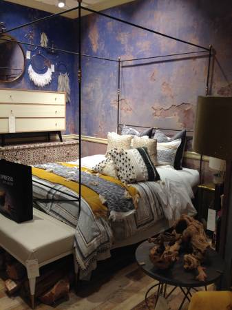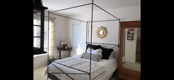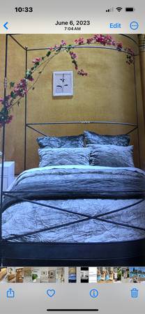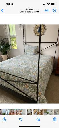 Queen size Anthropologie Rod Iron Bed Like New Has Brass Accents with a Grey Black finish Will work with many different design styles
