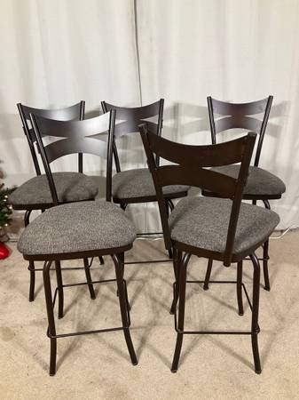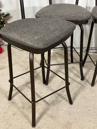 A blend of industrial style and comfort featuring sleek durable brown powder coated metal frames, padded seats upholstered in gray linen fabric, 360 degree swivel, back support and footrest. Perfect for kitchen counters, islands, bars or any entertaining area. Will sell in sets of 2 and 3 only. $25 each. Firm price. Great condition. Hablo español.