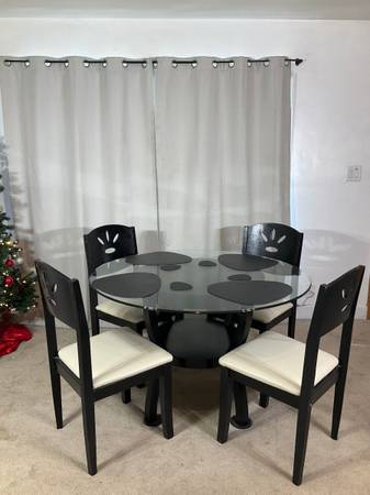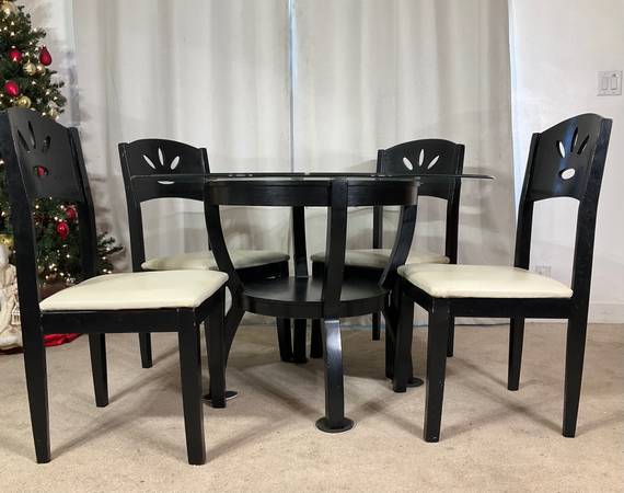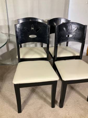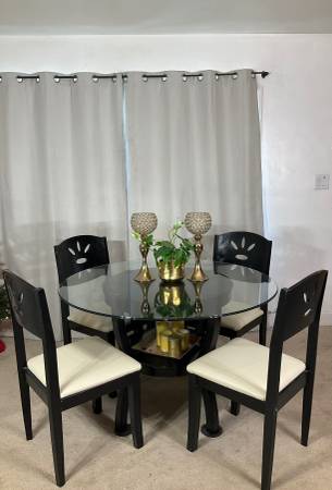 Elegant 4 ft Round beveled edge glass table top b black wooden base with lower shelf and 4 matching chairs with padded seats upholstered in off-white faux leather for a classic contrast. Solid, sturdy construction. Good used condition. Hablo español.
