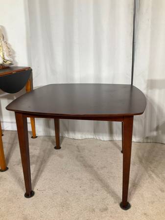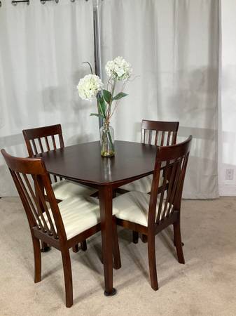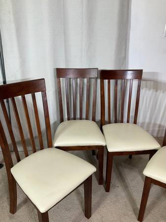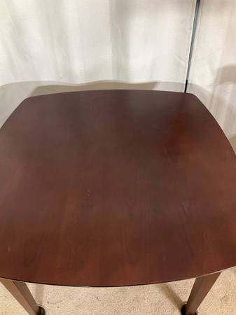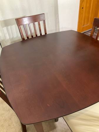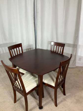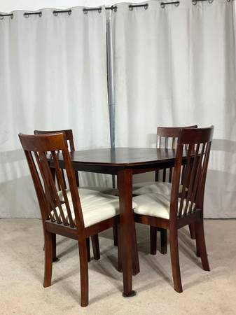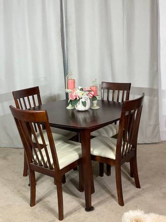 Crafted with simple lines, in rich cherry finish, the rounded corners 40” x 40” table brings timeless appeal while 4 matching chairs with tall backs and cushioned seats beautifully upholstered in oatmeal faux-leather keep with the streamlined design. Solid, sturdy construction. Good used condition with normal ware. Hablo español. Price is firm.