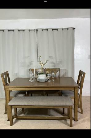 Whether you’re gathering to share a delicious meal or for game night full of laughter and fun, this six-piece dining set will make the heart of your home. Seamless 3‘ x 5‘ dining table in light walnut finish, 4 X-back chairs with gray linen cushion seats and a matching bench for a rustic feel. Solid sturdy construction. Great condition with normal wear. Hablo Español.