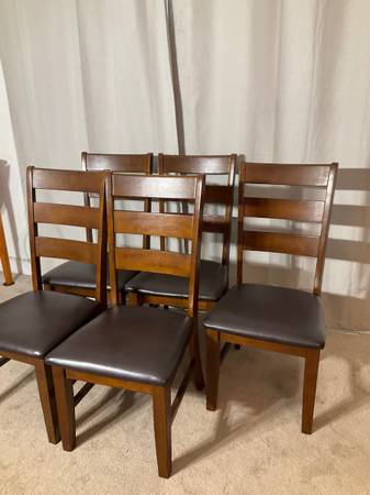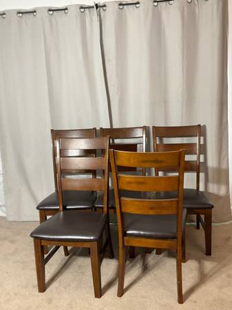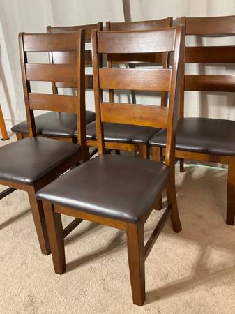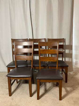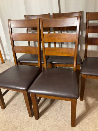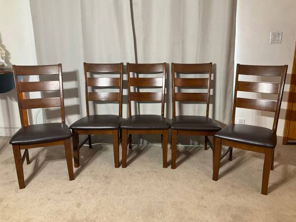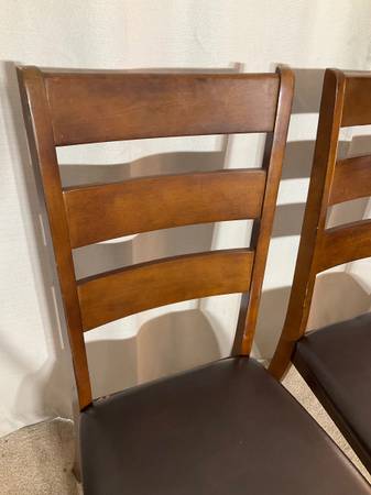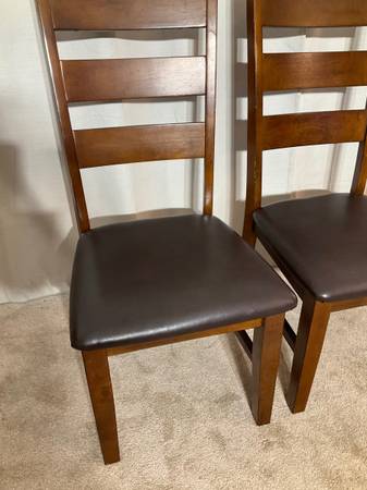 Upgrade your dining table, or simply add extra seating with these handsome standard height dining chairs featuring tall ladder back and wide cushioned seats. Solid wood frame in rich mocha finish with brown faux-leather cushioned seats makes them easy to match or combine with your table. Solid sturdy construction. Great condition! Hablo español.