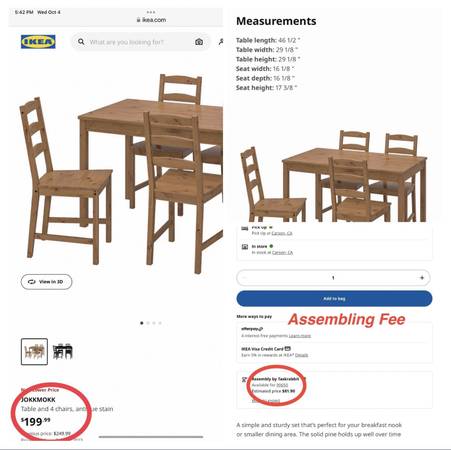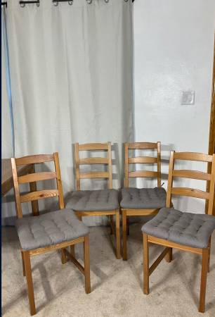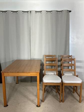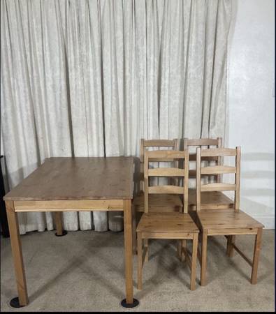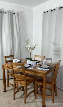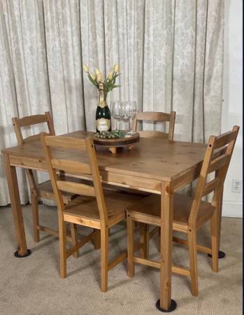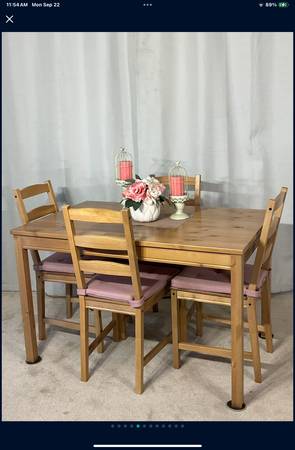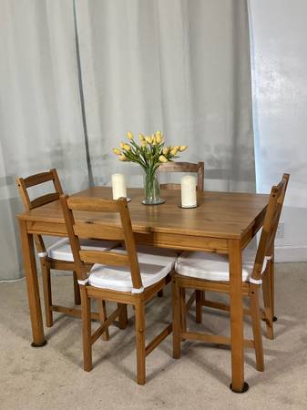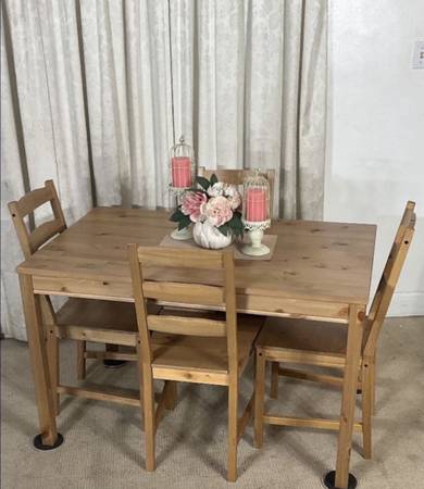 Crafted with small places in mind, this solid pine wood dining set from Ikea is the perfect solution for intimate dining. Finished in antique stain, the Jokkmokk collection includes your choice of pink, white or gray seat cushions. Will sell set without cushions for $160. GREAT CONDITION, ALREADY ASSEMBLED AND TAX FREE! FIRM PRICE