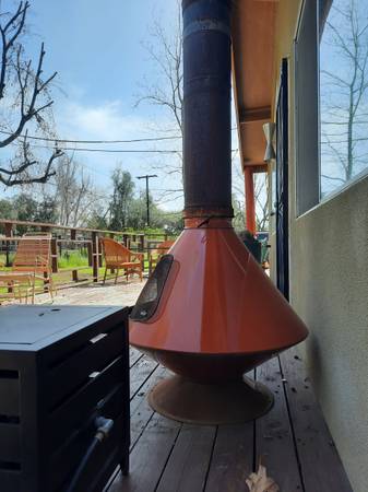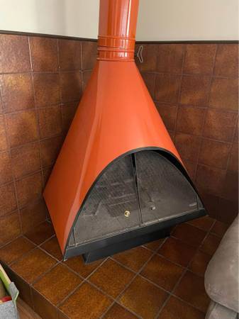 For sale is this amazing all original 1960's Majestic brand, American made, mid century modern original orange porcelain enamel fireplace in pristine condition, no scratches, no chips, has been utilized for wood burning but has gas attachment, log iron, flue adjuster, ash clean out trap and removable tray. It measures 7 feet tall with top chimney pipe atop, it had fit into a ceiling hood which stayed at original home. At it's widest it measures 3 feet wide, 2 feet deep, at the base it's 2 foot wide by 1.5 feet deep. The chimney pipe has an 8 inch diameter. I will be selling for a reduced $ 2195.00, down from $ 3000.00