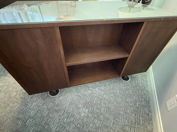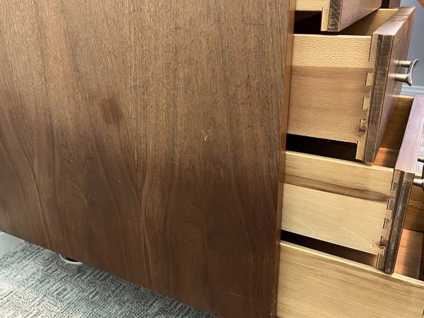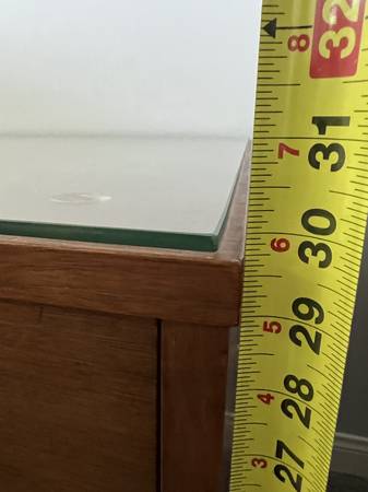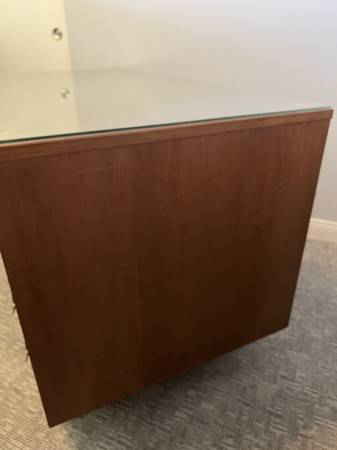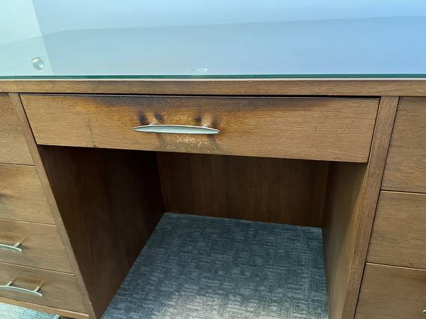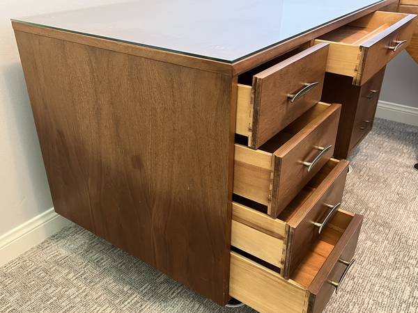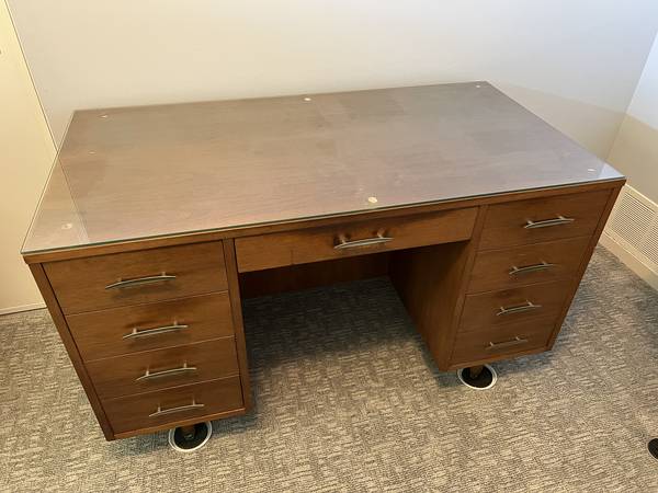 Desk was purchased new in early 1960s with one owner, non-smoking home. Original finish. Condition is very good with wear consistent with age and use as shown in photos. Glass top has protected the top surface since new.
