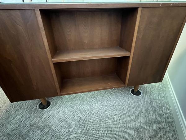 Vintage Attorney desk. Four drawers on left, three drawers on right (bottom drawer is double height with interior dividers), and center drawer with pen/pencil area and Sligh Lowry mark stamped inside. Front of desk has center shelves.