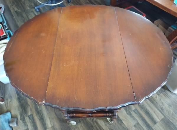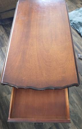 Vintage rolling maple drop leaf tea trolly. Drop down pull handle. Drawer and removable glass serving tray. 37 x 20 inches with sides down. 40 inches wide with sides up. 30 inches tall.