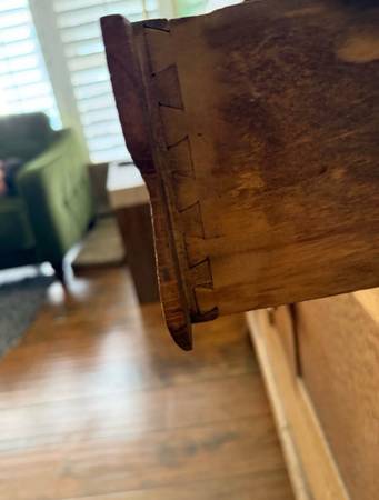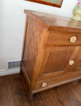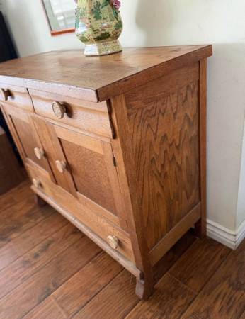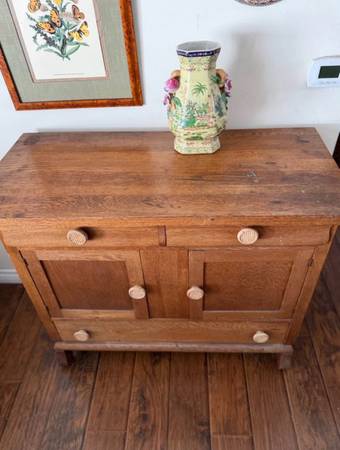 Solid Oak! Dovetailed working drawers. Two small on top and one large on the bottom separated by two cabinet doors. All wood down to the knobs. Normal wear and tear for age, see pics. Pick up in Orange, cash only. Delivery may or may not be available in the OC area.