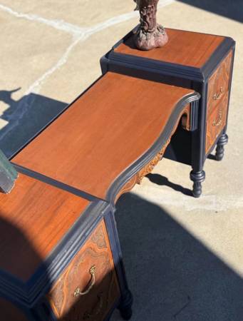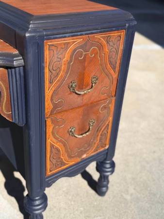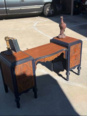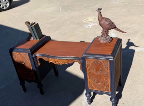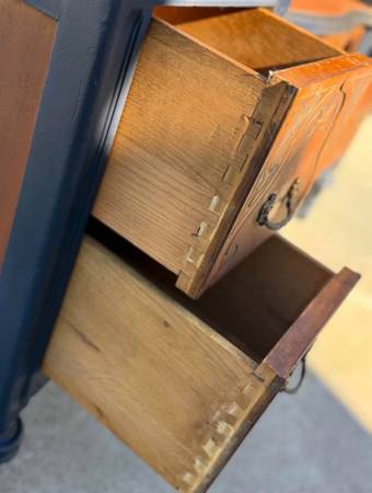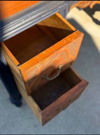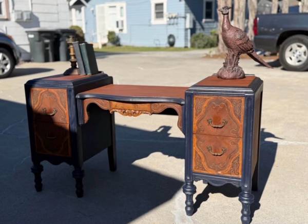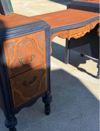 Beautiful deep blue and multi tone solid wood desk or vanity. Ornate details, dovetailed drawers that work well! Statement piece for sure! Normal wear and tear due to age and use, but still in great shape! Pick up in Orange, cash only. Delivery may or may not be available.