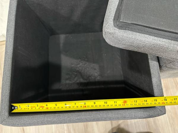 They material is gray cloth. They are in Good condition. The interior storage dimensions are 15x15”, and 12” deep.