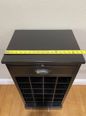 Wine Cabinet 24-Bottle is a great addition to your home. The simple design has straight lines and a dark finish has one drawer for extra space storage. The cabinet provide 24 slots for your wine bottles. Perfect storage piece for the wine enthusiast. assembled size is 18"W x 13.5"D x 36"H. $199 OBO CASH ONLY!!!
