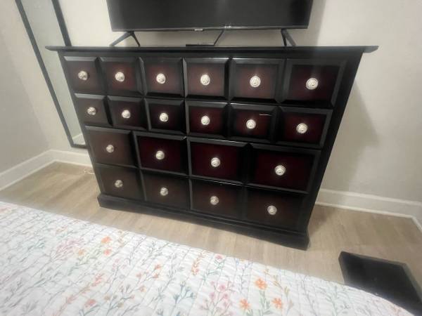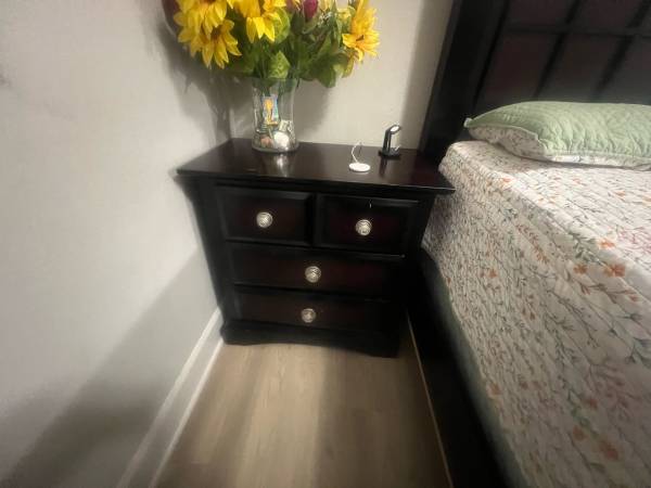 Queen bedroom set with mattress, dresser, and nightstand. Queen bed frame with mattress: $200 Queen bed frame without mattress: $150 Dresser: $70 Nightstand: $30 BUY ALL ITEMS AND GET $25 OFF!!...