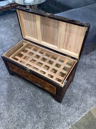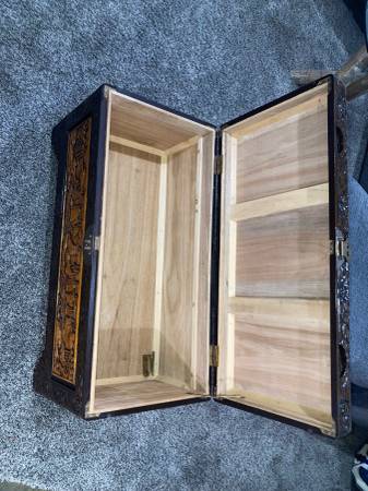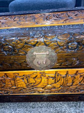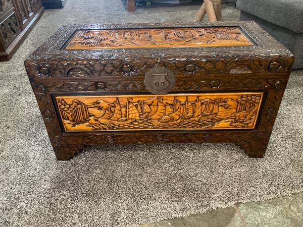 Intricately carved wood chest. In pristine condition no signs of wear. Comes with lock. Lined with Camphor wood and smells wonderful. Includes camphor wood, sweater rack insert. 35”long x 17” deep x...