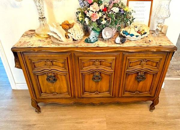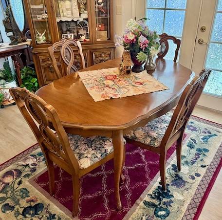 French Provincial Dining Room set includes Dining room table with table insert, China Cabinet/Hutch and Buffet Cabinet/server. Three large pieces. Well cared for. Sold as is.