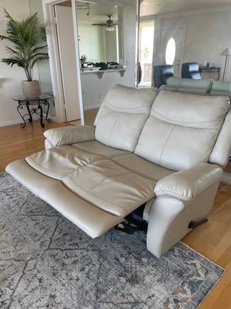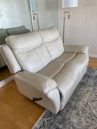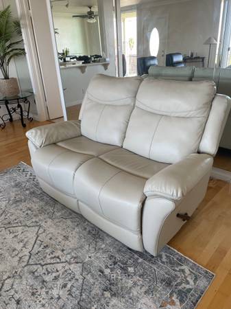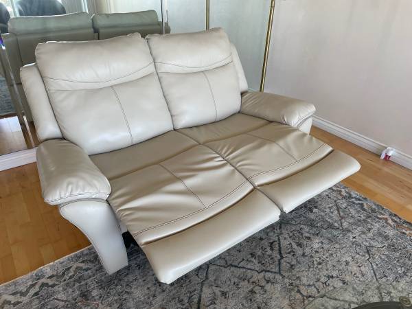For sale is a comfortable leather reclining loveseat in a neutral, light-toned leather that brightens any room. Both seats recline easily and smoothly, offering excellent comfort for relaxing, watching TV, or reading.