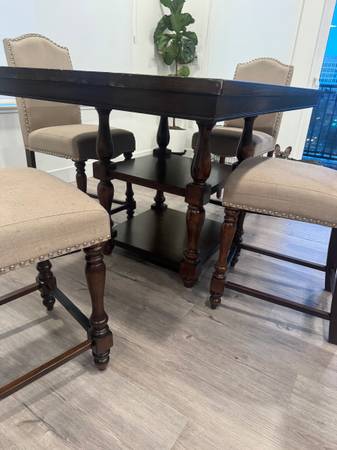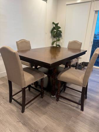 selling table and 4 chairs table measures 42W x 60L x 36H and comes with 4 chairs table in great condition and some chairs show worn. 1 chair has water stains as pictured $300 OBO. must be able to...