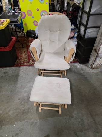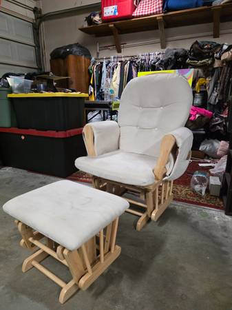 Comfortable glider rocking chair with matching ottoman. Smooth gliding motion makes it perfect for relaxing, nursing, or reading. Features padded armrests, cushioned back, and light wood frame. Upholstery is soft and supportive. Cushions just need to be washed as it was in the garage.Local pickup only. Cash only.