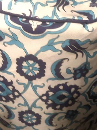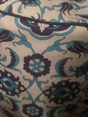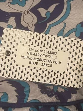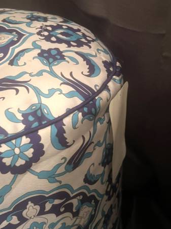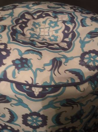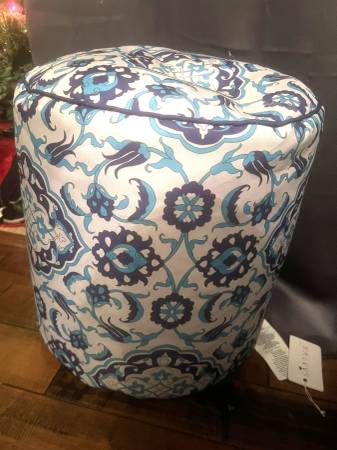 Here is a lovely Moroccan style stuffed stool. This furniture poof is a white-ish color with a blue damask design. Measures about 18" tall. Brand new! Come get it today!