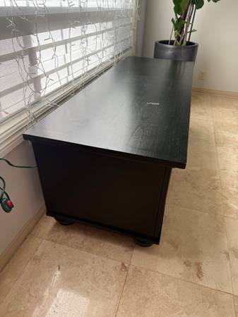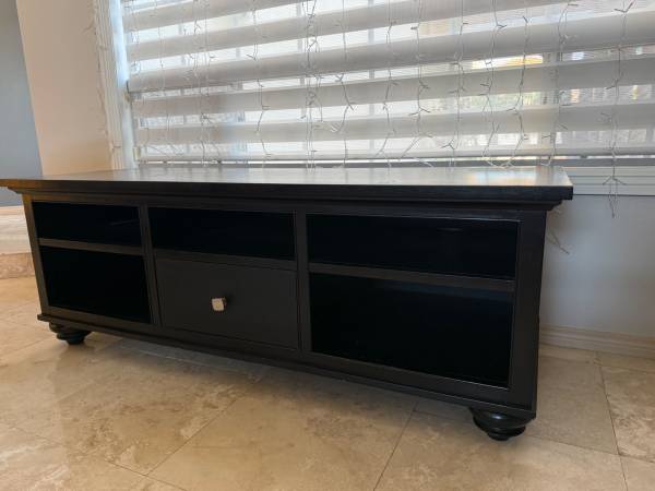 Sturdy Black TV Entertainment Center. It is a heavy and sturdy piece that can handle a large television. It has four open storage shelves for components (game consoles, receivers) and one central drawer for remotes or accessories.
