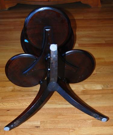 1946 Four Tier Mahogany Plant Stand. 27" Tall Top platform is 16" Diameter Lower three platforms 11" Diameter Widest points widest point of stand 24"
