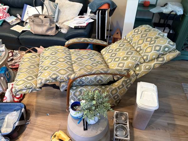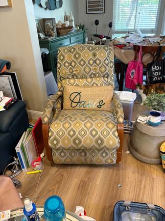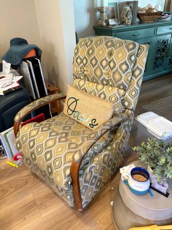 This genuine La-Z-Boy is SOLID structurally, and sells for $1,199.00 when it is new. This price of $195 is AWESOME!! The "Harbor Town" model swivels AND glides! It can be partially reclined (i.e. just feet or just back), or it can be fully reclined. (SEE PHOTOS) The upholstery is custom and GORGEOUS! It does have some wear and tear in the form of "pulled threads" from my cat, HOWEVER, THERE ARE NO RIPS, NO STAINS, NO HOLES. The wooden part of the armrests was chewed on by my puppy, but it's hardly noticed and can definitely be sanded and stained if you are handy. The stock pictures show the exact model of this chair and all of the dimensions/measurements. Local pickup near 405/22 freeway intersection. Call me at show contact info