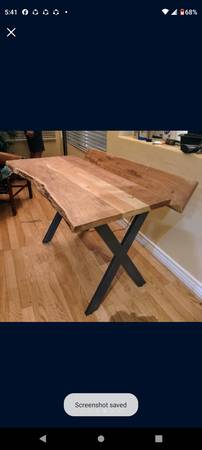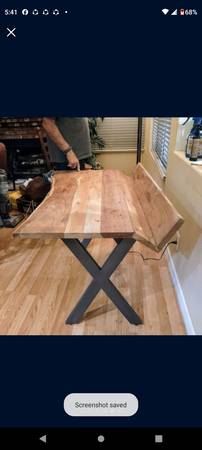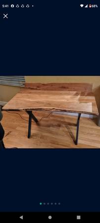 Live edge table desk, rustic-style made of a solid hardwood butcher block style plank top with a live front edge, steel legs, and a non-removable rear media stand for papers, magazines, and books, etc.