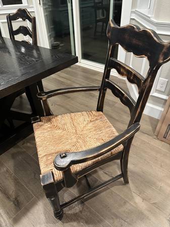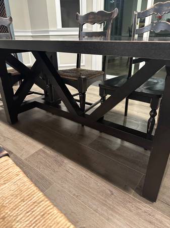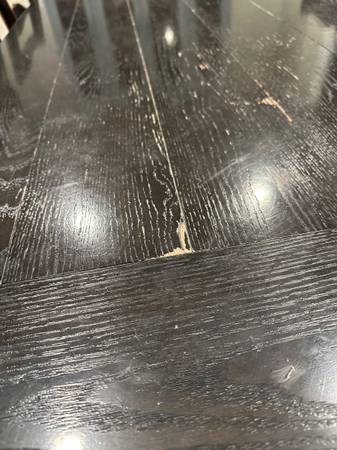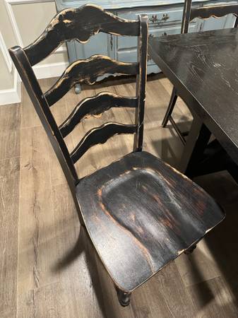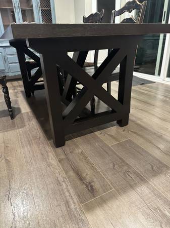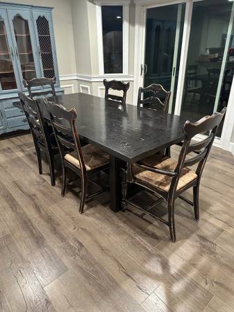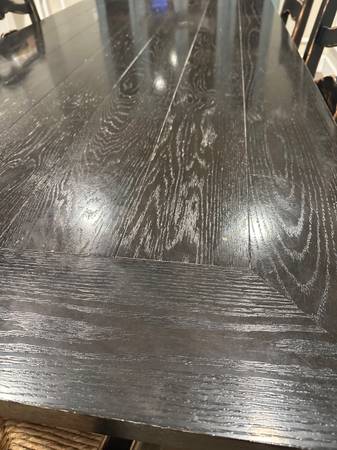 Solid wood oak stained dining table. Includes 7 chairs. Beautiful, heavy duty table but needs refinished. 40 inches wide, 84 inches long, 30 inches tall. Very heavy and would need several people to...