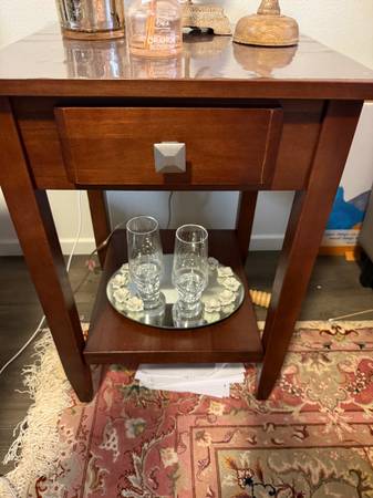 Leather Couch/ sofa. Gray in color.Willl seat 3 to 4 people dimensions are 86” wide and 40” from the wall back to front also One auto man in that has Storage. Two end tables. Sofa has no rips...