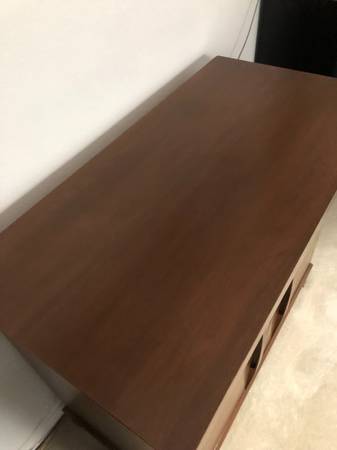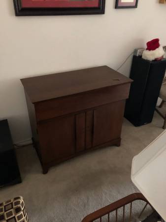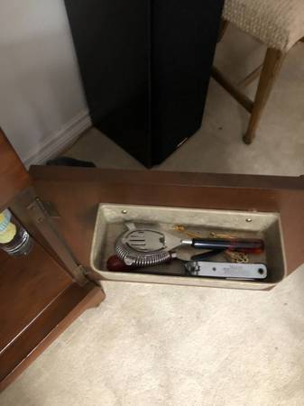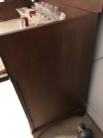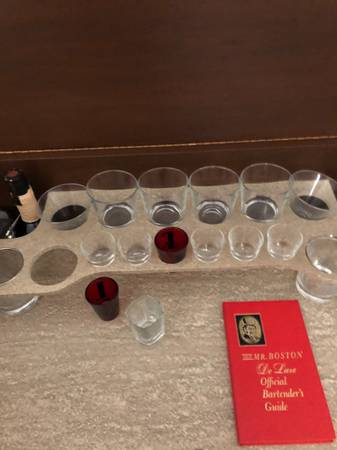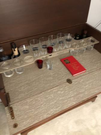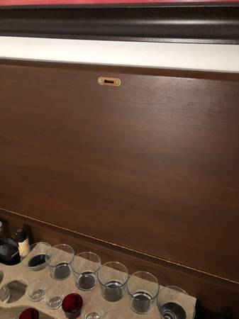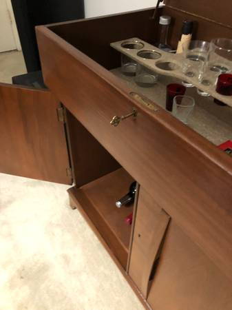 Here is a beautiful Mid Century Modern Dry Bar .Its from the 60s made of solid wood ,with a great finish on it .the clean lines means it will fit with any décor. Its perfect for all your holiday parties .or just a special gift .as you can see form the pictures that is has its original Formica in perfect shape .also the original key ,so you can lock up your good whiskies or wine Im not in a hurry to sell it so please no lowball offers ,OBO none of the items other than the bar is included ,I will give you some of the glassware that fits in the bar