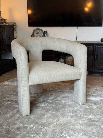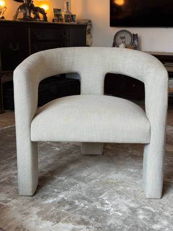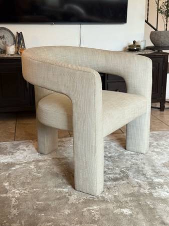 This is a stunning Restoration Hardware Ines Open Back Chair in excellent condition. Upholstered in a linen weave in sand. It has been gently used with no tears, stains, or damage, it’s in great shape. The fabric is easy to clean and made to last.