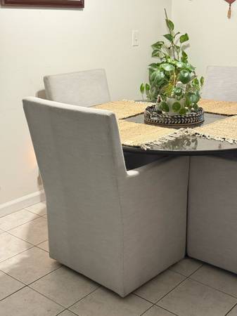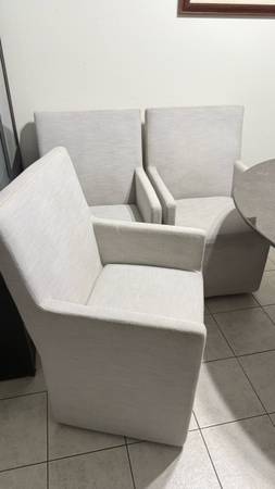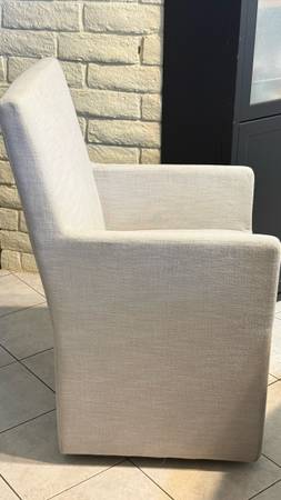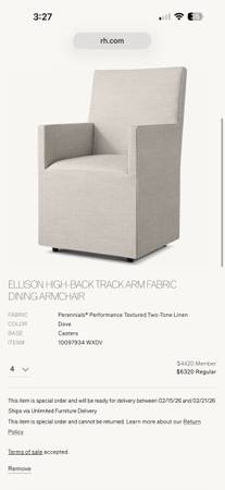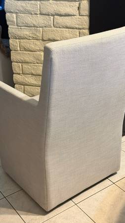 I have a set of 4 beautiful Restoration Hardware Ellison High-Back Track Arm Fabric Dining Armchairs in excellent condition. They have caster wheels. Upholstered in Perennials® Performance Textured Two-Tone Linen in Dove color with caster bases. This performance fabric is very easy to clean and maintain. Clean, no tears or stains.